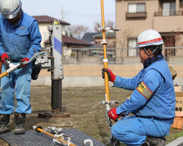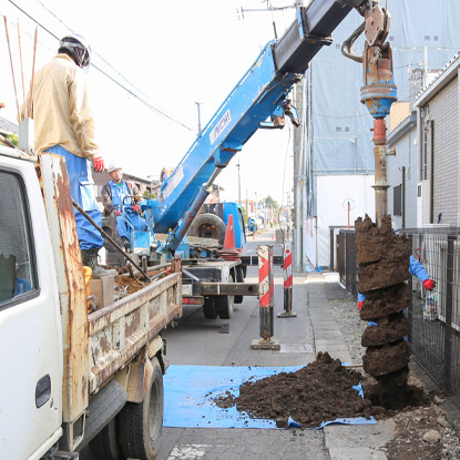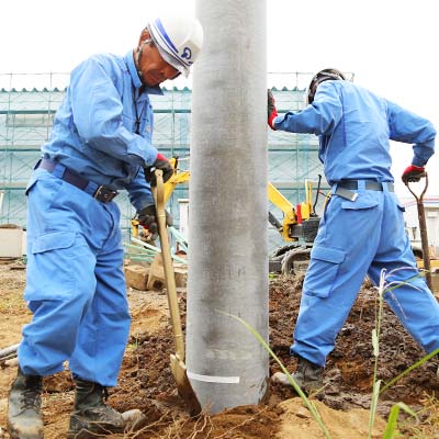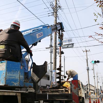 建柱には「掘削」「建柱」「埋め戻し」「整地」などの工程があります。多くの外線工事業者では、建柱を外部委託することが多いようですが、小淵では自社の穴掘建柱車を使用して施工するので、低コスト・短期間での施工が可能です。