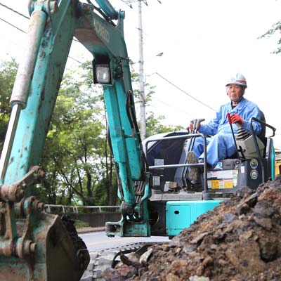 小淵では、強みとなっている建柱工事のノウハウを生かし、無線基地局(携帯電話・PHS)の施工工事を行っています。高さ15mの高所作業車や穴掘建柱車を自社保有しているので、低コスト・短期間で、一貫したスピーディーな対応が可能です。また、バックホーも保有しているため、玉石が出る現場でも対応可能です。伊勢崎市内を中心に、群馬県全域で対応しています。